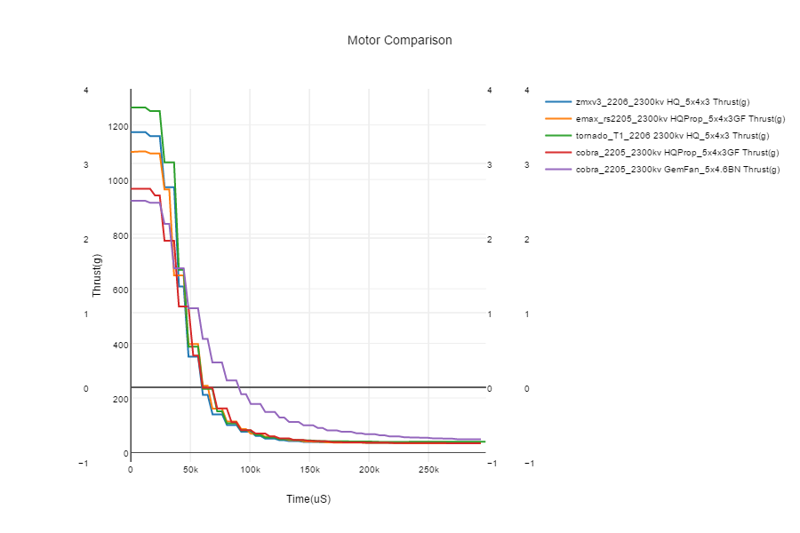 In this example there are two variances we care about related to the two axes of this graph. The vertical axis is thrust output, and the horizontal axis is time. This translates into a gap in performance between motors that is clearly visible between lines on the graph. Here we see a gap in thrust output at the top and a gap response time performance to the left. In terms of response times the steeper the slope the better, and the less of a "tail" or slope on the settling side the better. For thrust clearly the higher the number the better. You can see that motor choice has a significant impact on the acceleration time.